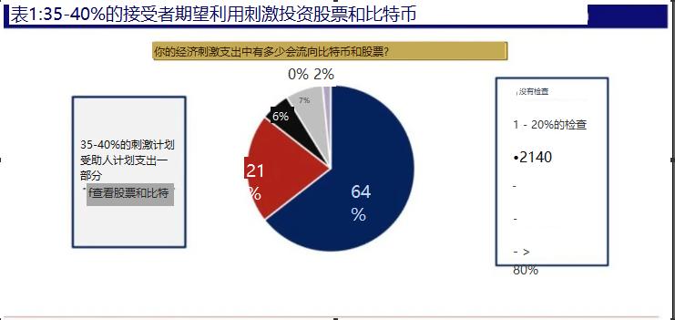调查发现,大约有20%的受访者希望把不超过20%的纾困金投资到股市或者比特币,13%的受访者希望把20%至80%的纾困金用于投资,另外还有2%的受访者计划用于投资的资金比例则是达到了80%或更高。