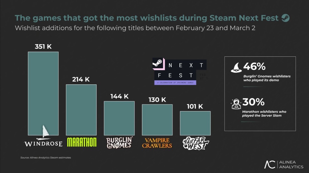 需要说明的是,Alinea Analytics明确表示这些数据仅为“估算”,并非绝对准确。但它足以让你大致了解,在2026年Steam Next Fest期间,哪些游戏真正吸引了玩家的目光。