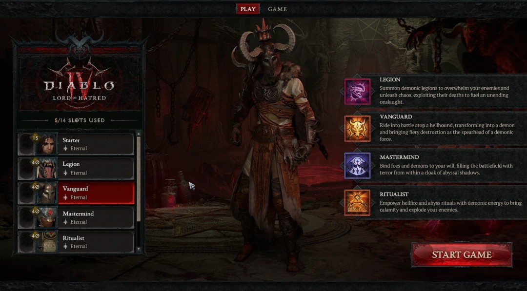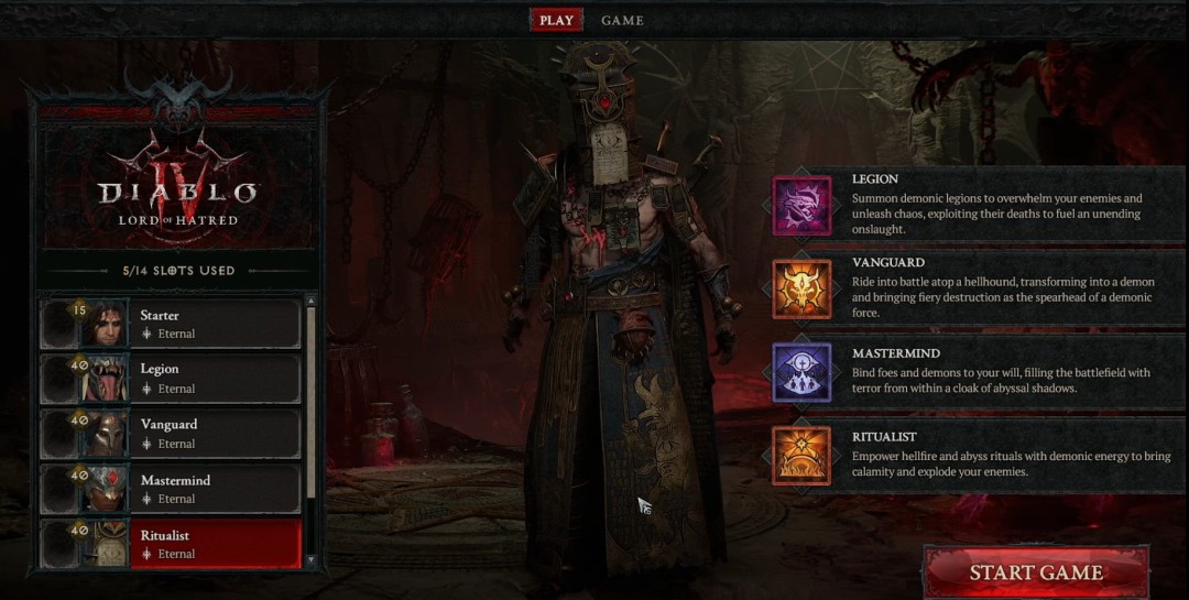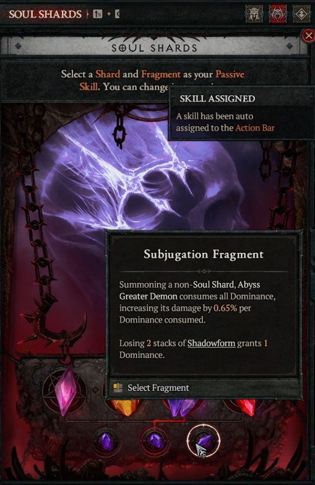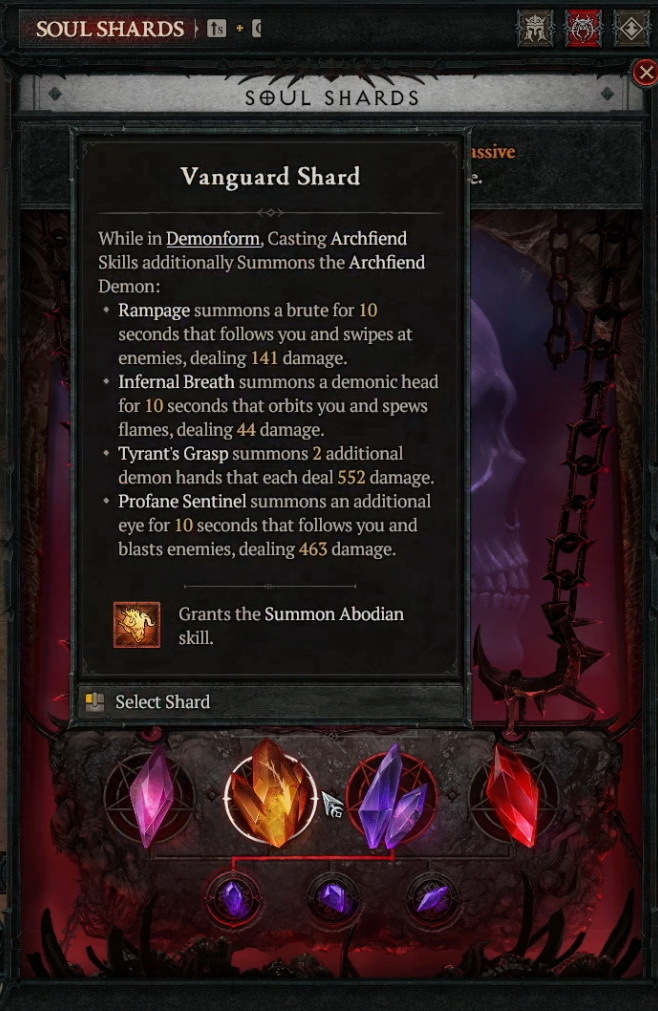 在游戏介面中,可以看到灵魂裂片系统,玩家可以选择一个裂片与三个碎片,首先可从四个主要灵魂裂片选择其一,藉此打造自己的力量与玩法,包括军团、先锋、谋主与祭仪四个主要裂片,每个主要裂片会提供一个转化游玩方式的被动效果,并可束缚一个特定的恶魔宠物。玩家接着可从下方三个碎片选项中择一,作为决定被动技能、资源和技能的专精。