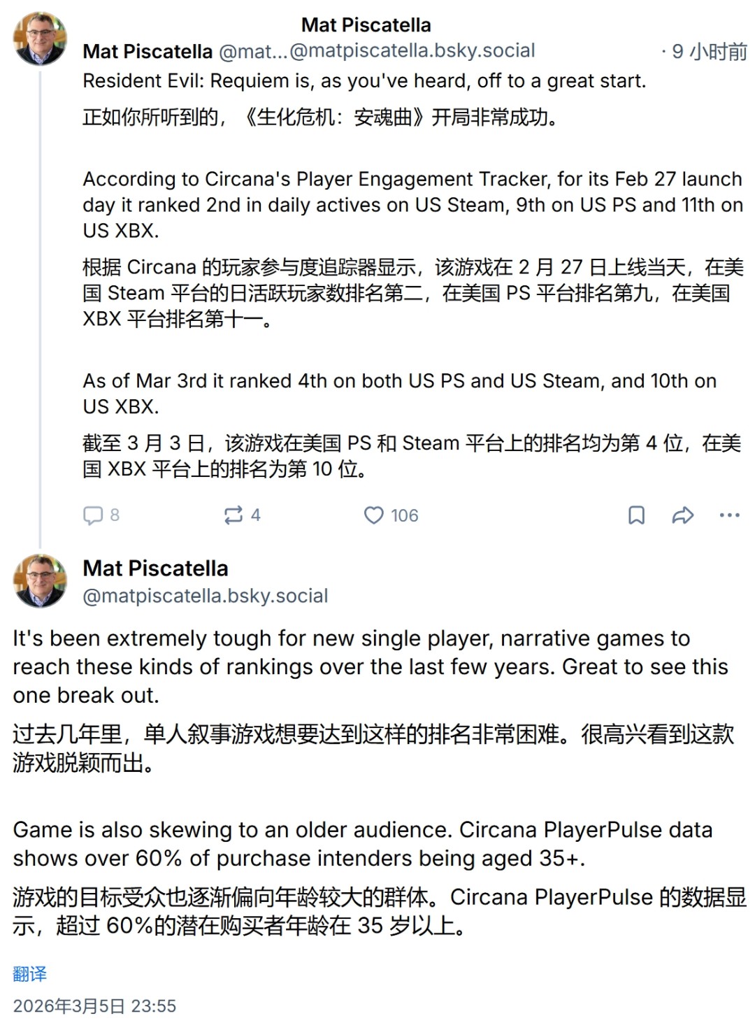 该数据源于Circana游戏行业执行总监Mat Piscatella于3月5日在社交平台发布的帖文。他指出:“近年来,原创单机叙事类游戏在销售排行榜上表现普遍乏力,但本作成功突围。PlayerPulse数据显示,其购买意向者中35岁以上玩家占比超过60%。”这一数据明确指向《生化危机:安魂曲》,并揭示了该作品在美国玩家群体中显著的“老龄化”特征。