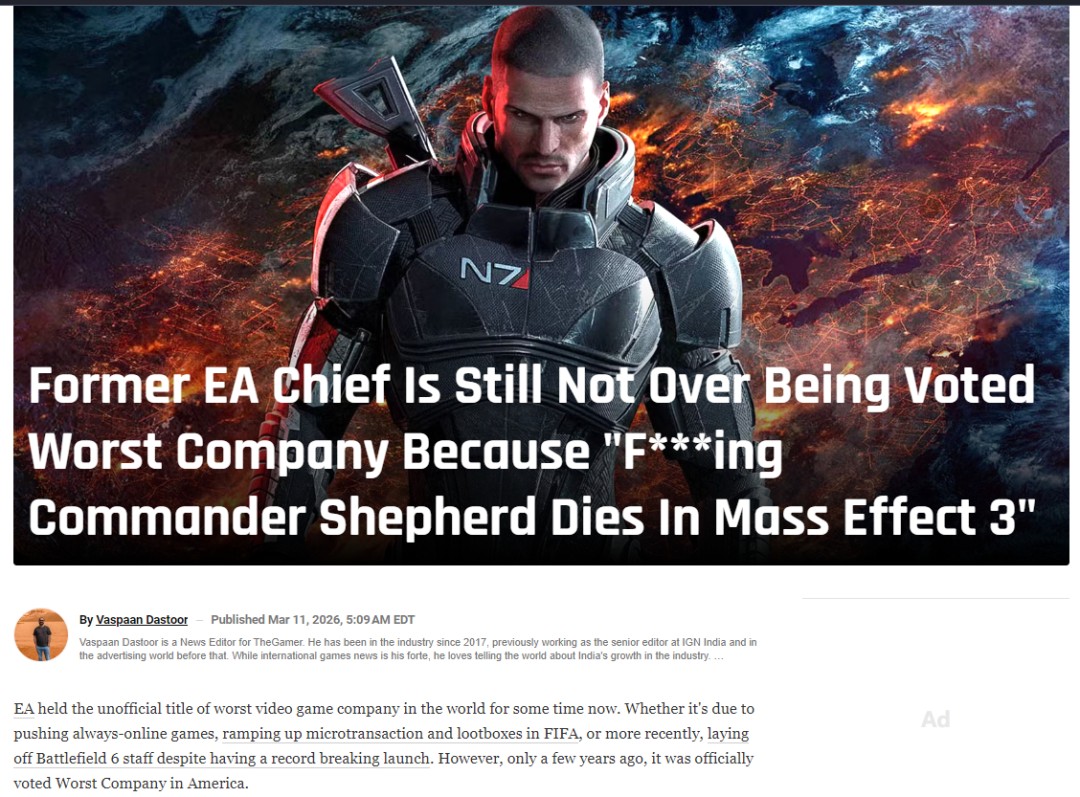 “那时候,英国石油公司(BP)正在污染墨西哥湾。美国银行因为次贷危机把全球经济拖下水。但《质量效应3》里他妈的指挥官谢泼德死了,于是我们就成了美国最糟糕的公司。”
